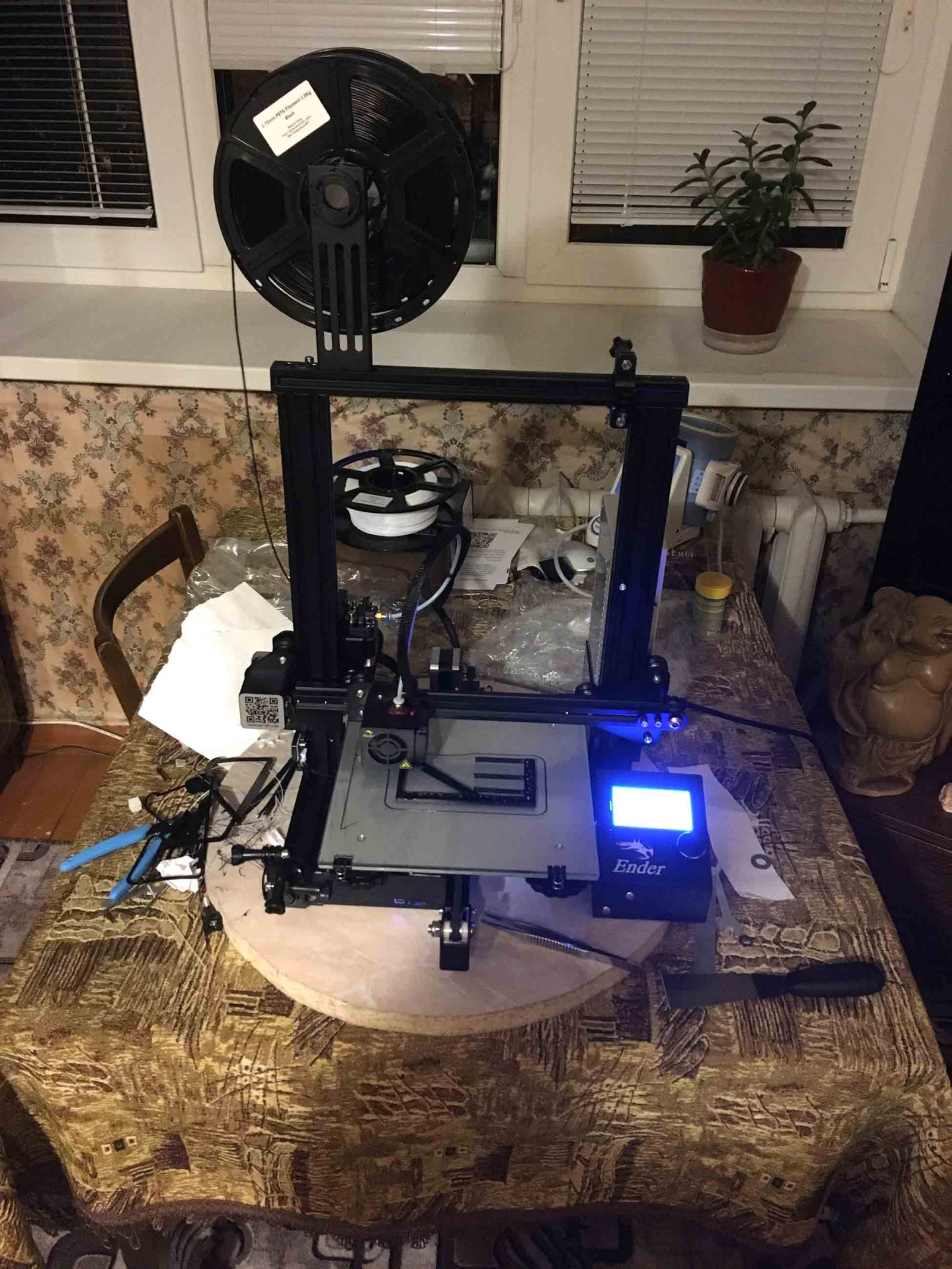 Сборка заботливыми но кривыми руками, заняла всего 5 часов, от вскрытия коробки до начала печати. Рекомендую использовать для сборки мануалы на ютубе, там гораздо подробней лучше описаны ньюансы сборки. По качеству комплектующих на данный момент нареканий нет, кроме стола, но для меня не критично, за эту цену отличный аппарат, а недостатки давно исправлены сообществом.