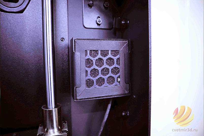 Так как этот принтер разработан с заявкой на профессиональность, в нем, как и в моделях подороже появился угольный воздушный фильтр, устраняющий неприятные запахи при печати пахучими пластиками. Фильтр легко снимается, а за ним расположен вентилятор, обеспечивающий циркуляцию воздуха при закрытом кожухе.