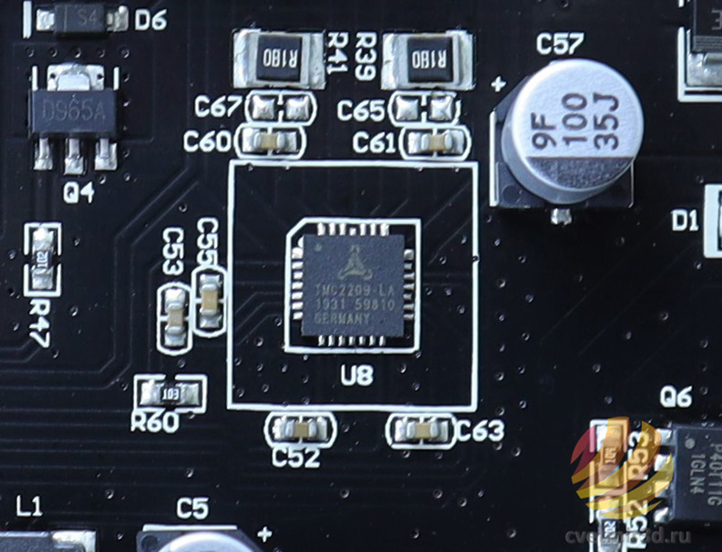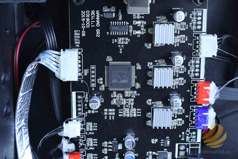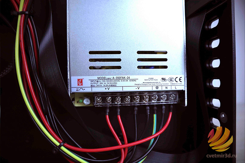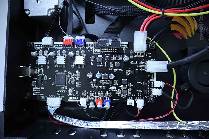 Заглянем вовнутрь корпуса, где находится вся электронная начинка. Сердцем принтера является фирменная плата, обновлённая, но похожая на предшественницу. Основана она на процессоре STM32, за движение отвечают современные тихие драйвера TMC2209, к сожалению, распаянные на плате. Про них мы поговорим отдельно. Для охлаждения платы есть тихий, но мощный вентилятор. Установлен блок питания на 24 вольт мощностью 350 ватт. Его с запасом хватает для питания принтера. Все провода обжаты в клеммы и аккуратно уложены, что несомненно радует и даёт плюсик к безопасности.