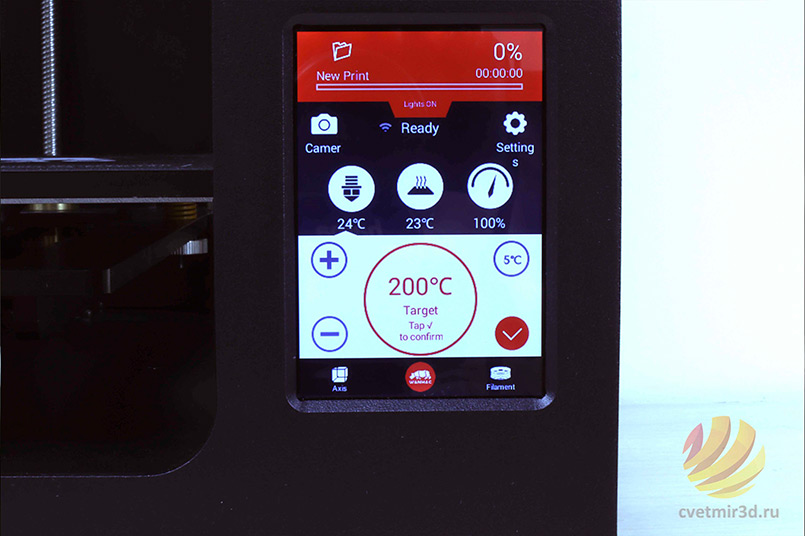 На главном экране можно увидеть информацию по печати, температуры хотэнда и стола. Над ними находятся кнопки входа в меню настроек и камеры.