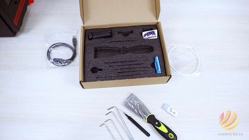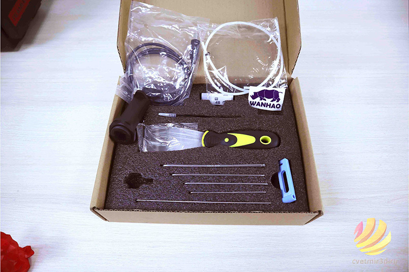 Вместе с принтером поставляется довольно богатая комплектация. Помимо необходимых вещей, таких как провод питания и USB шнур для подключения, в комплекте есть катушка пластика PLA, весом 1 килограмм и коробка с инструментами и запчастями. Разберём её подробнее. Внутри лежит флешка на 4 ГБ, на которую записан слайсер Wanhao Cura, шпатель для поддевания моделей, заточенный, что немаловажно, острый пинцет, шестигранники всех необходимых размеров для ремонта и настройки принтера. Из дополнительных частей тут находится крепление для тефлоновой трубки на корпус и держатель для катушки на заднюю стенку. Рассчитан он, кстати, на катушки до 750 грамм, что странно. Версия для продажи будет комплектоваться сменным нагревательным блоком в сборе с соплом и металлическим термобарьером, предназначенным для печати ABS и другими высокотемпературными пластиками. Нам же его не положили. А в расширенной версии поставки мы также получим акриловый кожух для принтера, состоящий из стенок, крыши и дверцы с удобной ручкой.
