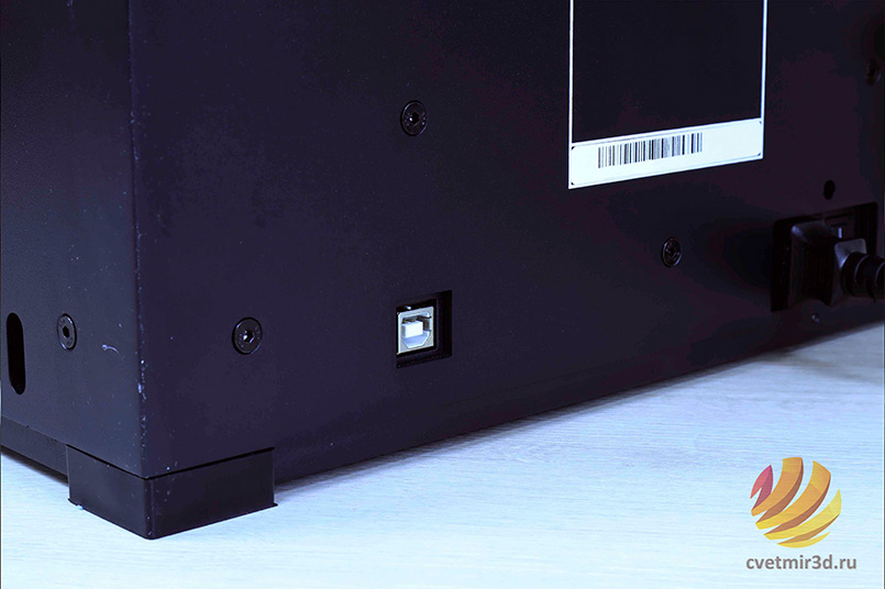 Под дисплеем расположился порт для SD карты и USB разъём стандарта два ноль, а подключение к компьютеру осуществляется с задней стороны принтера.
