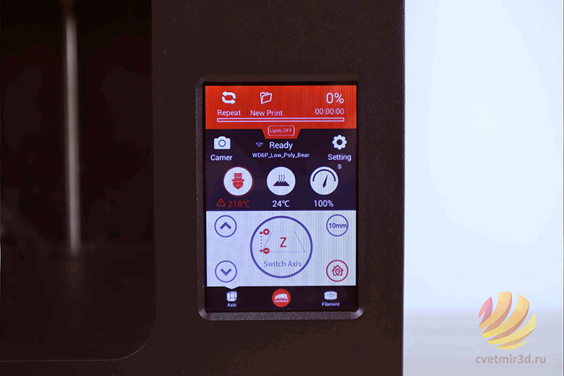По нажатию на иконку Axis в левом нижнем углу, принтер переключается на ручное управление осями. Ось выбирается нажатием на центральную копку, боковыми кнопками можно осуществлять движение.