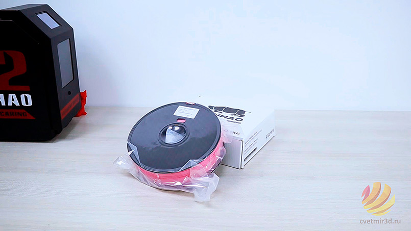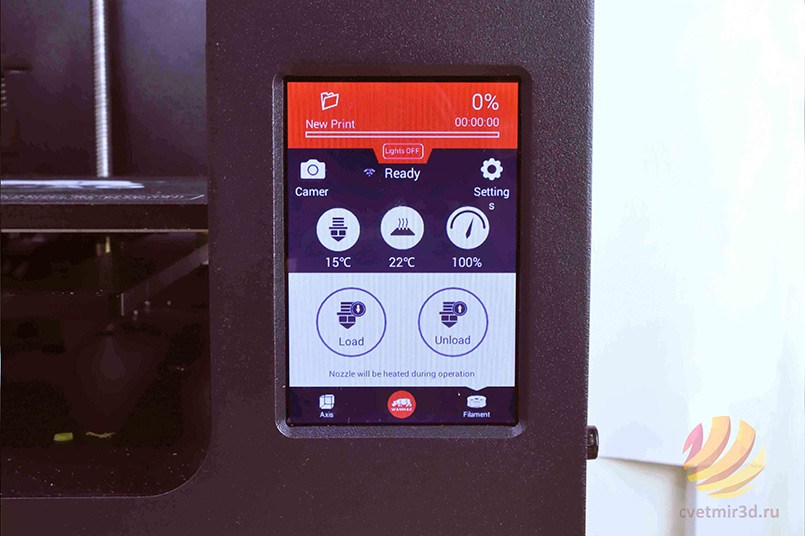 Последний шаг перед началом печати – это загрузка филамента. Выставляем на дисплее необходимую температуру преднагрева, далее заходим в меню Filament и жмём Load. Заталкиваем пруток в отверстие сверху, до упора, а принтер сам начнёт подавать пластик, когда будет достигнута указанная вами температура.