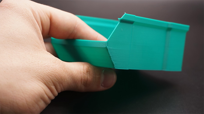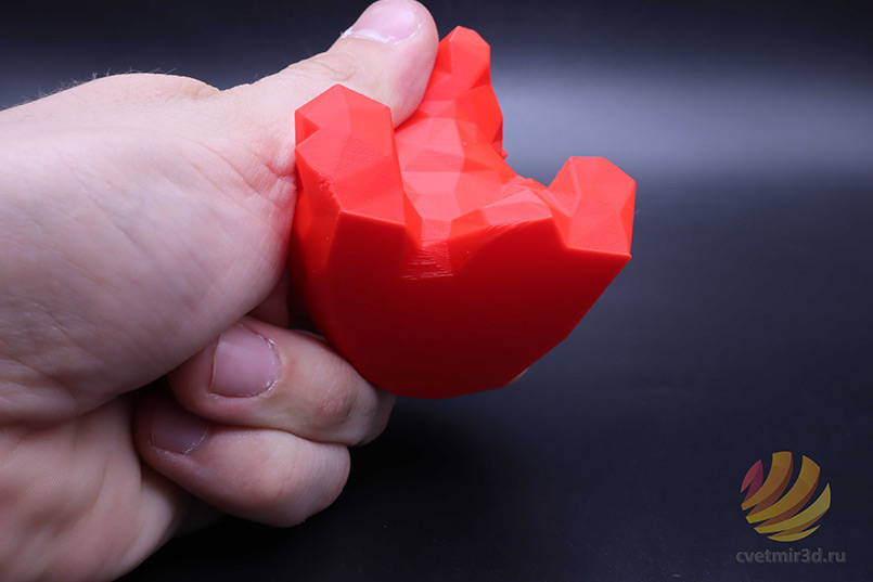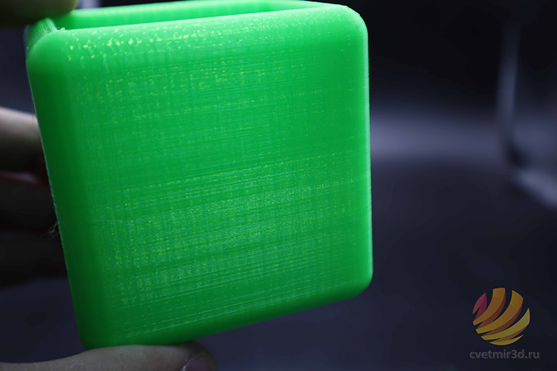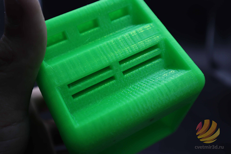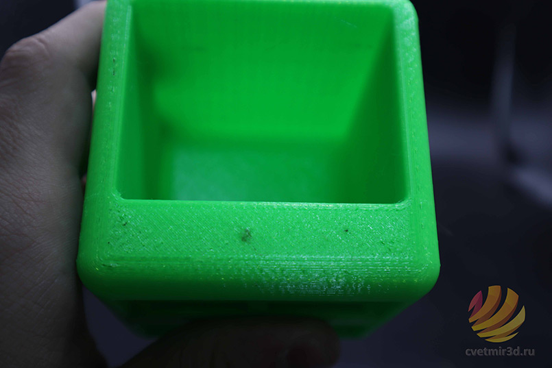 Как мы видим при закрытой камере Wanhao GR2 прекрасно печатает сложными пластиками. Толщина стенки этой модели всего 1,2 мм. Но её не повело, и не разорвало между слоями, что часто бывает на открытых принтерах. Взглянув на плоскость прилегания можно ещё раз убедиться, что она плотно прилипла к столу и не отрывалась. Из косяков можно отметить видимый шов на одном из углов модели, но его спокойной можно удалить при помощи любого инструмента. Такой результат вдохновил нас попробовать печатать на этом принтере чем-то посложнее ABS.