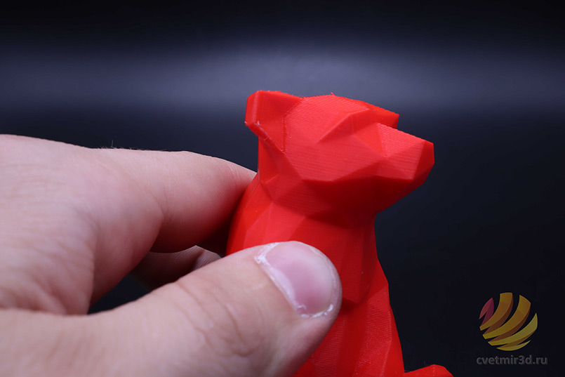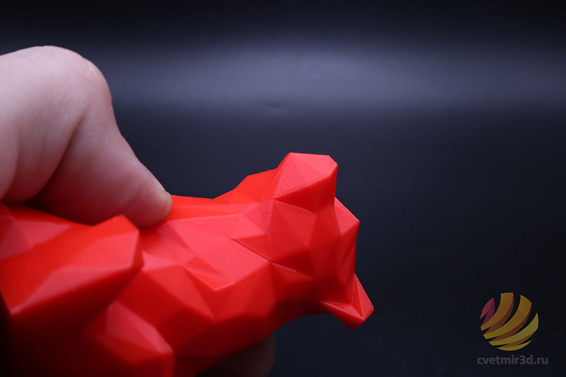 Мы видим отличное качество напечатанной модели. Самые сложные элементы – нависание под ногой и на подбородке отлично пропечатались, хоть и ничем не поддерживались. Единственные сложности возникли с очень резким нависанием в районе уха, да и то только потому, что модель не была развёрнута им к вентилятору. Грани модели ровные, слой к слою, видимых наружных дефектов не наблюдается. Достойный результат.