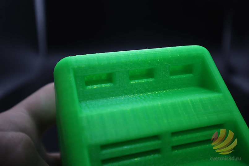 Теперь осмотрим получившуюся модель столь интересного цвета. Не смотря на высокую текучесть PETG, вся модель распечаталась очень качественно. Нависающие части здесь меньше, чем на медвежонке из PLA и они пропечатались лучше. Отверстия под флешки и карточки нигде не провисли. Скругления в нижней части тоже. Есть проблемы с небольшой недоэкструзией на верхних слоях, но я бы связал это с недостаточной плотностью стенок модели. На боковых гранях это не проявляется.