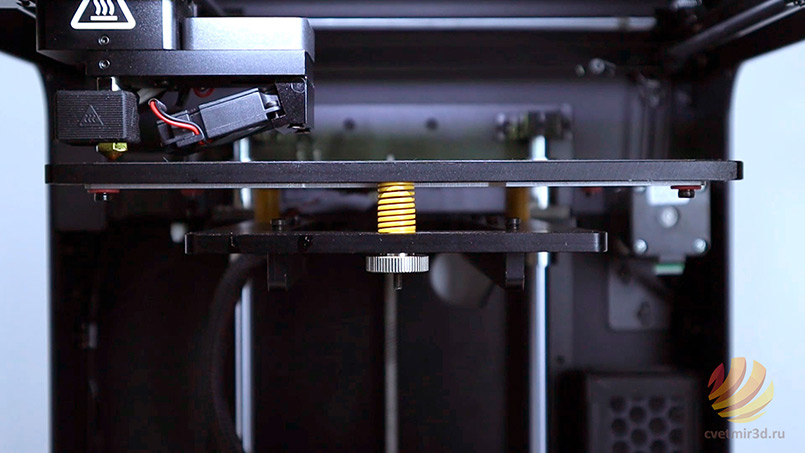 Как и в младшей модели основой кинематики послужила схема, подобная принтерам “Ultimaker”, где каретка экструдера движется по перекрещённым полированным валам, скользя на латунных втулках. Ось Z претерпела изменения и теперь вместо дорогой и, зачастую, среднего качества ШВП установлен обычный 4-х заходный винт T8 с «Антивобблинговой» гайкой. Сам стол представляет собой плиту, толщиной 6мм, снизу которой крепится нагреватель, а сверху наклеено адгезивное покрытие. К станине стол, как и раньше прикручен на 3 болта с пружинами и железными гайками «барашками».