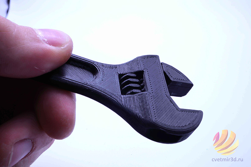 Поменяв пластик на Поликарбонат от компании Polymaker, мы запустили на печать довольно известную модельку гаечного ключа, фишка которого в том, что он полностью функционирует сразу после печати. В модели уже предусмотрена поддержка и при печати включать её не нужно.